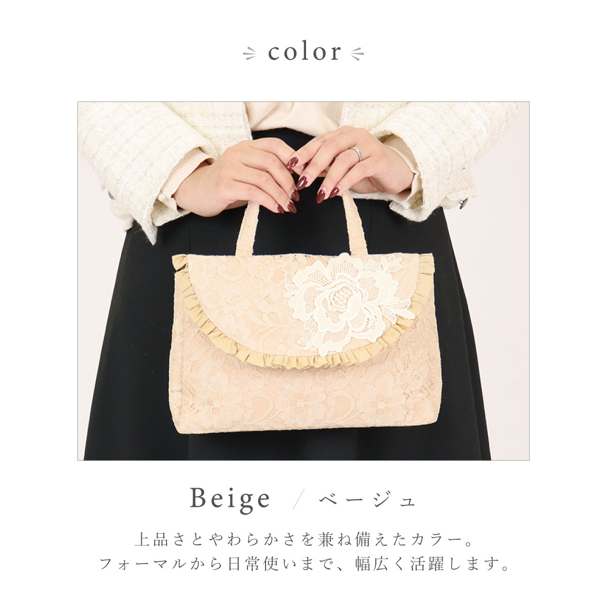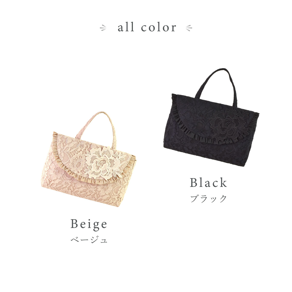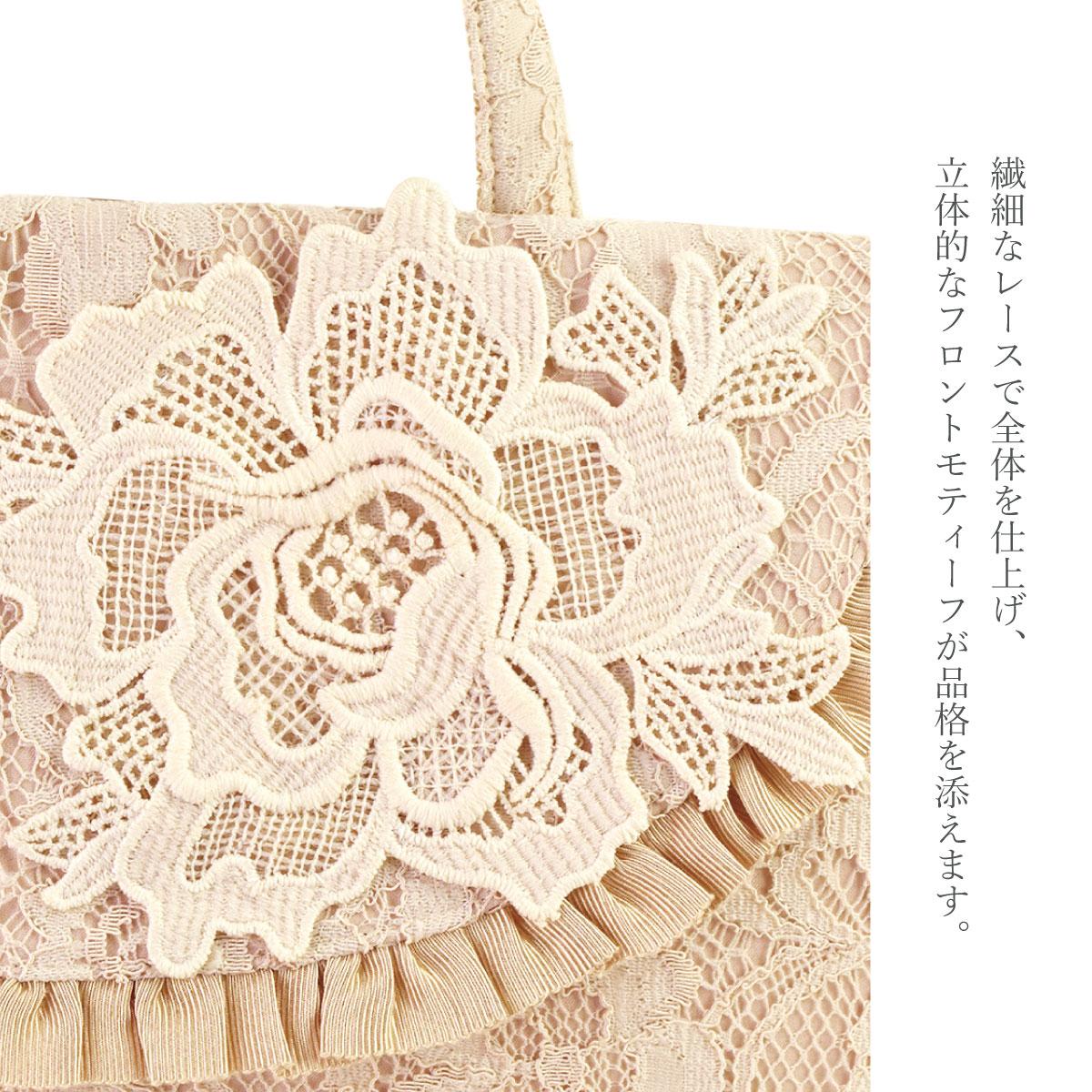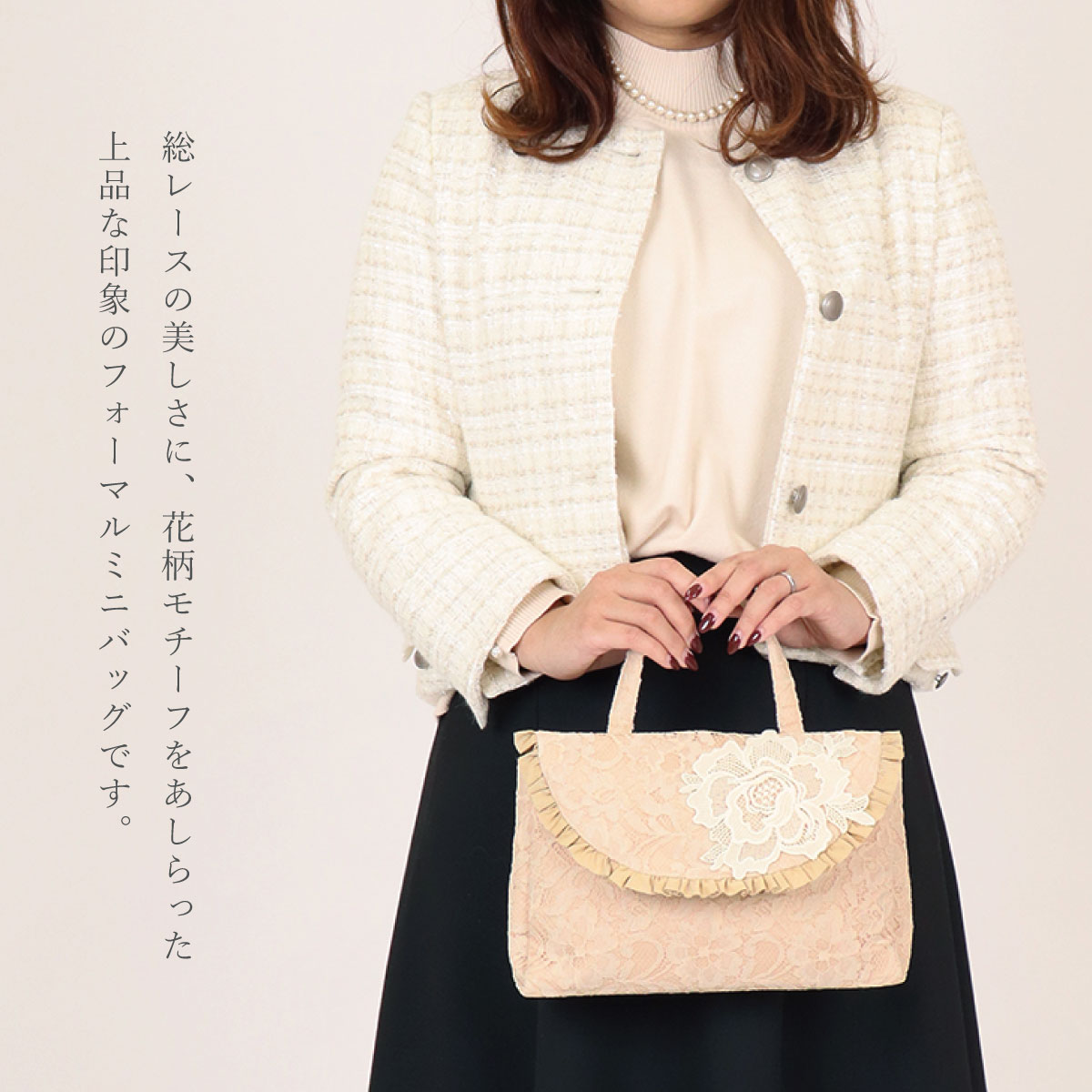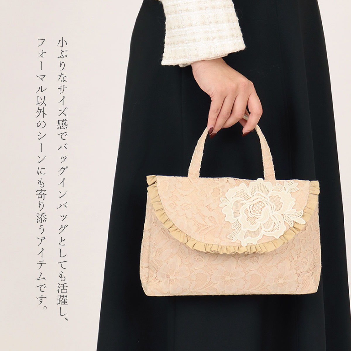 総レースとお花のモティーフがポイント。大きなバッグの中から取り出して会場でおつかいいただくなどありそうでなかったサイズ感のフォーマル対応◎