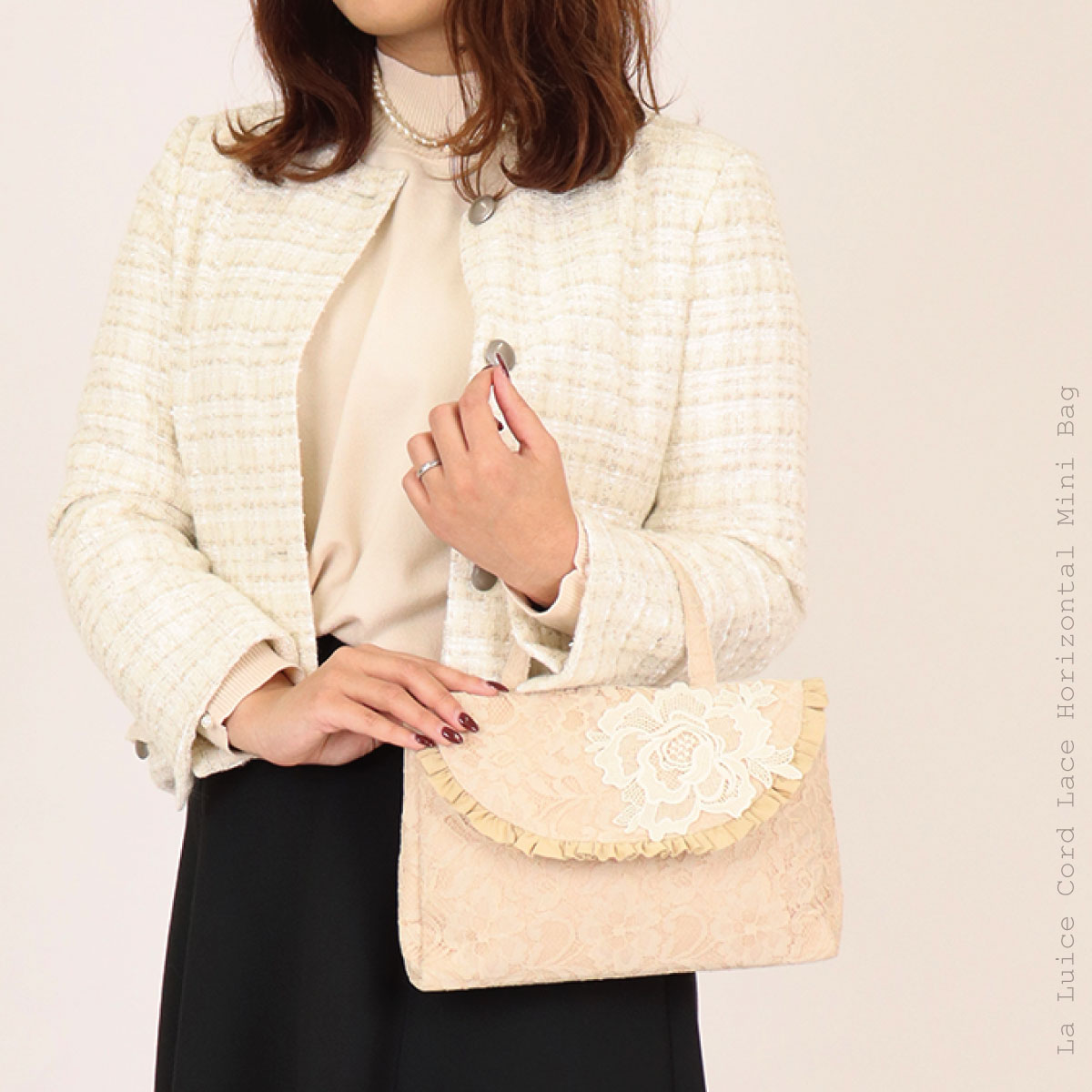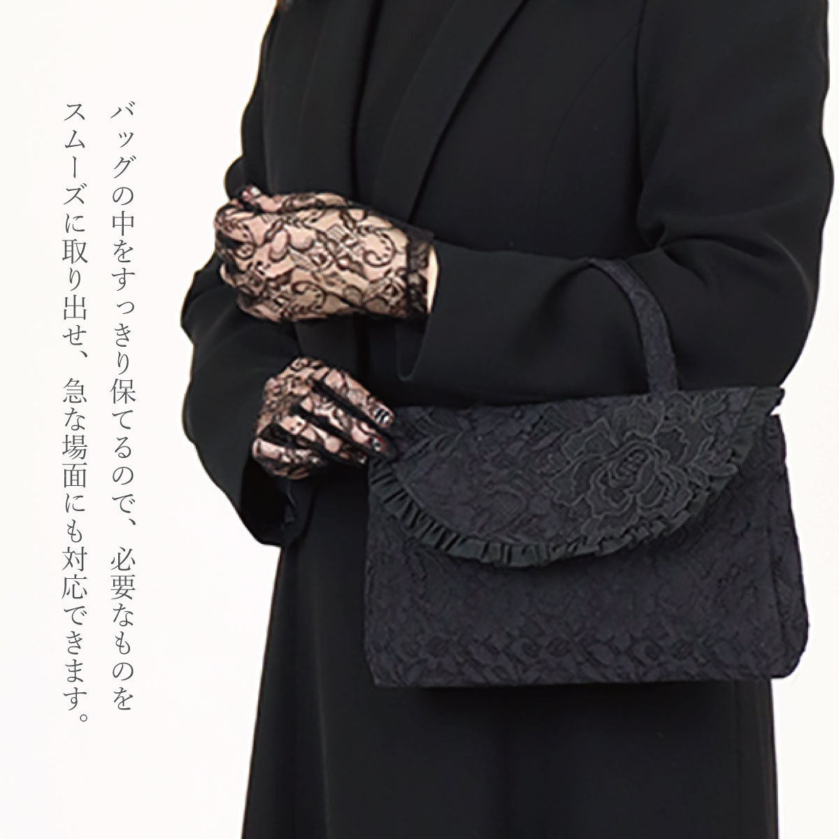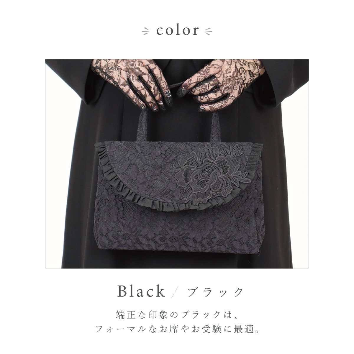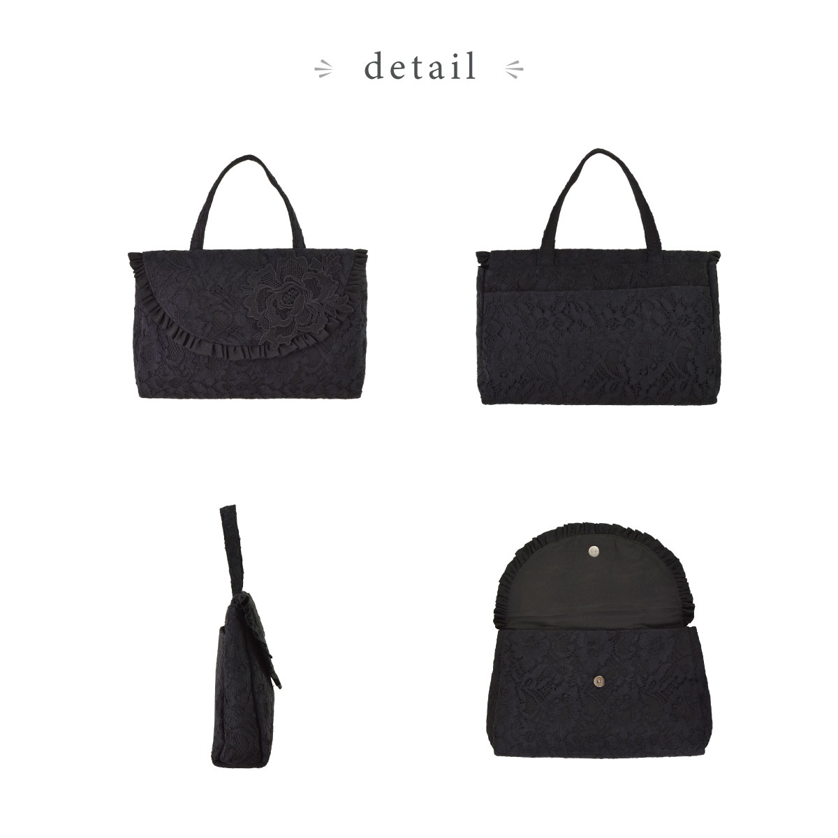 総レースとお花のモティーフがポイント。大きなバッグの中から取り出して会場でおつかいいただくなどありそうでなかったサイズ感のフォーマル対応◎