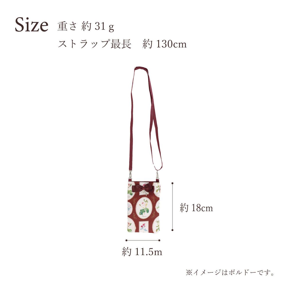 | サイズ: | 縦約18cm×横幅約11.5cm ストラップの長さ最長約130cm |