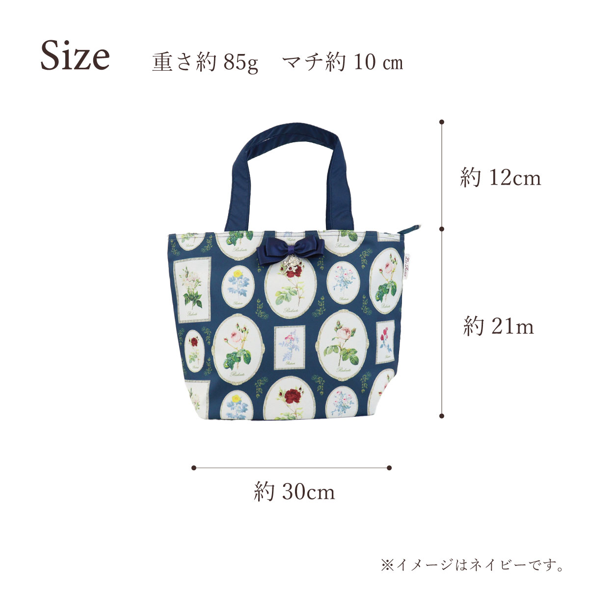 | サイズ: | 縦約21cm×横幅約30cm マチ約10cm 持ち手立ち上がりサイズ約12cm |