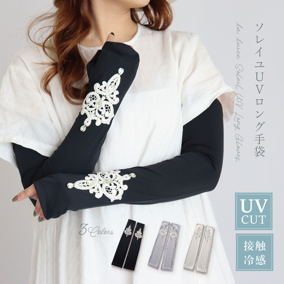 手袋 ロング UVカット ひんやり冷感 UPF50+ 日焼け防止 紫外線 指あり パール 竹繊維 ブラック 花 おしゃれ アームカバー 誕生日 母の日 ギフト LALUICE