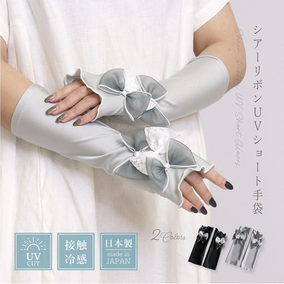 手袋 アームカバー おしゃれ かわいい UV ショート 日焼け防止 冷感 日本製 指なし レース リボン フリル ブラック グレー 【LALUICE ラルイス】