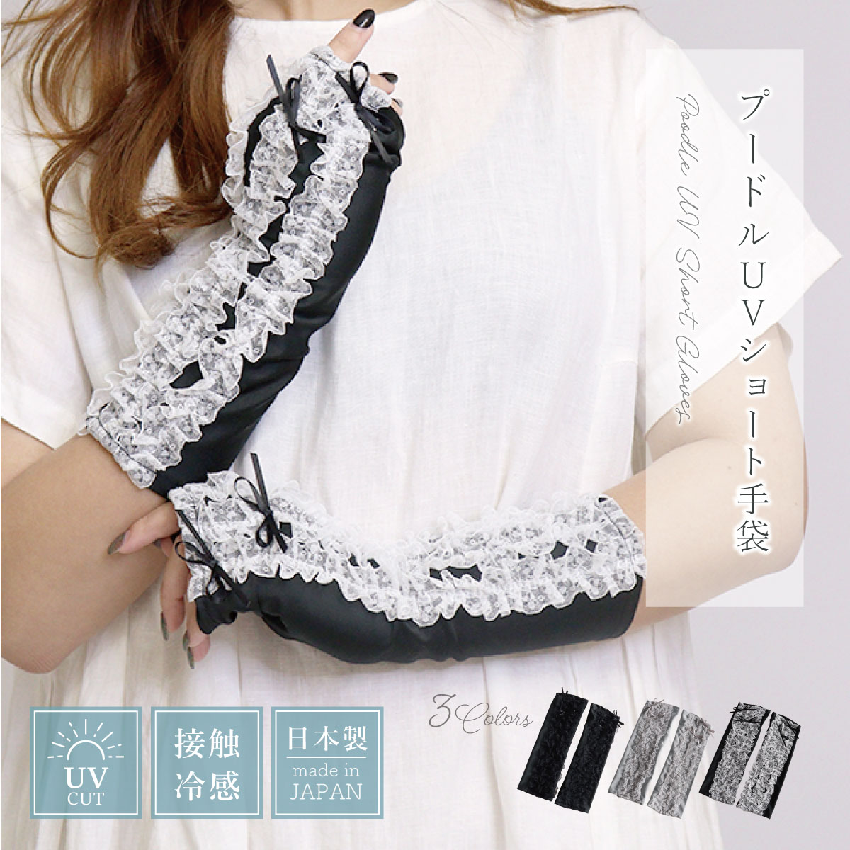 手袋 アームカバー おしゃれ かわいい UV ショート 日焼け防止 冷感 日本製 指なし レース フリル リボン ブラック グレー 【LALUICE ラルイス】