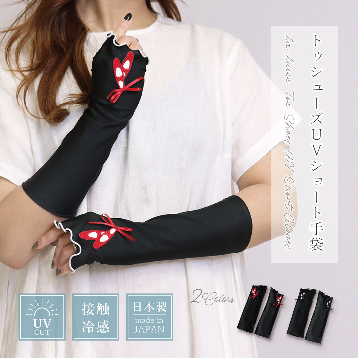 手袋 アームカバー おしゃれ かわいい UV ショート 日焼け防止 冷感 日本製 指なし フリル リボン ブラック トゥシューズ 【LALUICE ラルイス】