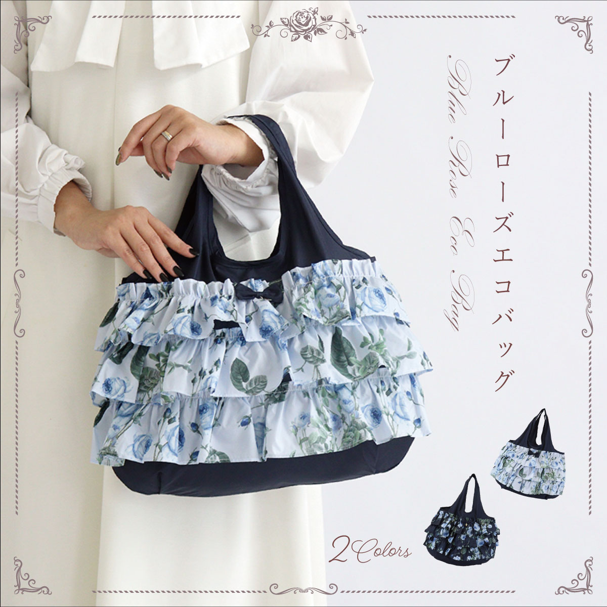 バッグ エコバッグ 折りたたみ コンパクト かわいい おしゃれ フリル 撥水 内ポケット ストラップ 花柄 レース バラ 薔薇 プレゼント 【LALUICE】