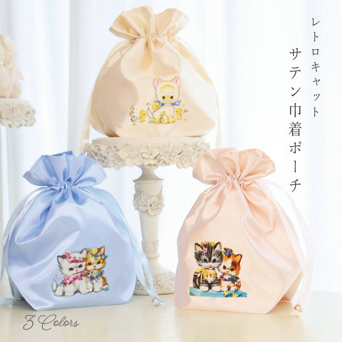 巾着 レトロ キャット 猫 サテン コスメポーチ 化粧ポーチ かわいい おしゃれ ミニバッグ 巾着バッグ ギフト LALUICE