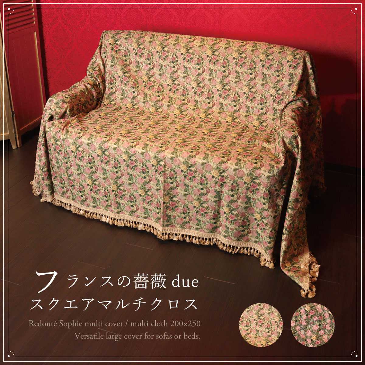 【セール♪】マルチカバー マルチクロス 250×200 長方形 生地 ポリエステル タッセル ソファカバー ラグ ベッドカバー カバー バラ 薔薇 スクエア ベージュ 【LALUICE】