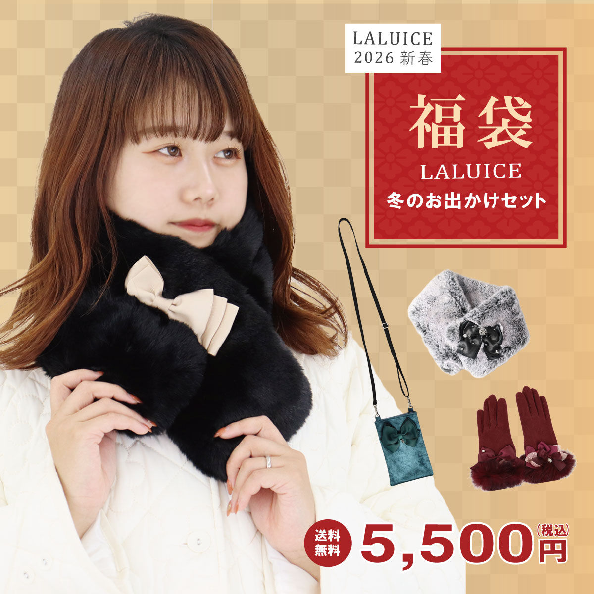 数量限定 福袋 2026 ハッピーパック ハッピーバッグ お買い得 レディース 可愛い ファッション ティペット 手袋 ファー スマホショルダー 送料無料【LALUICE】